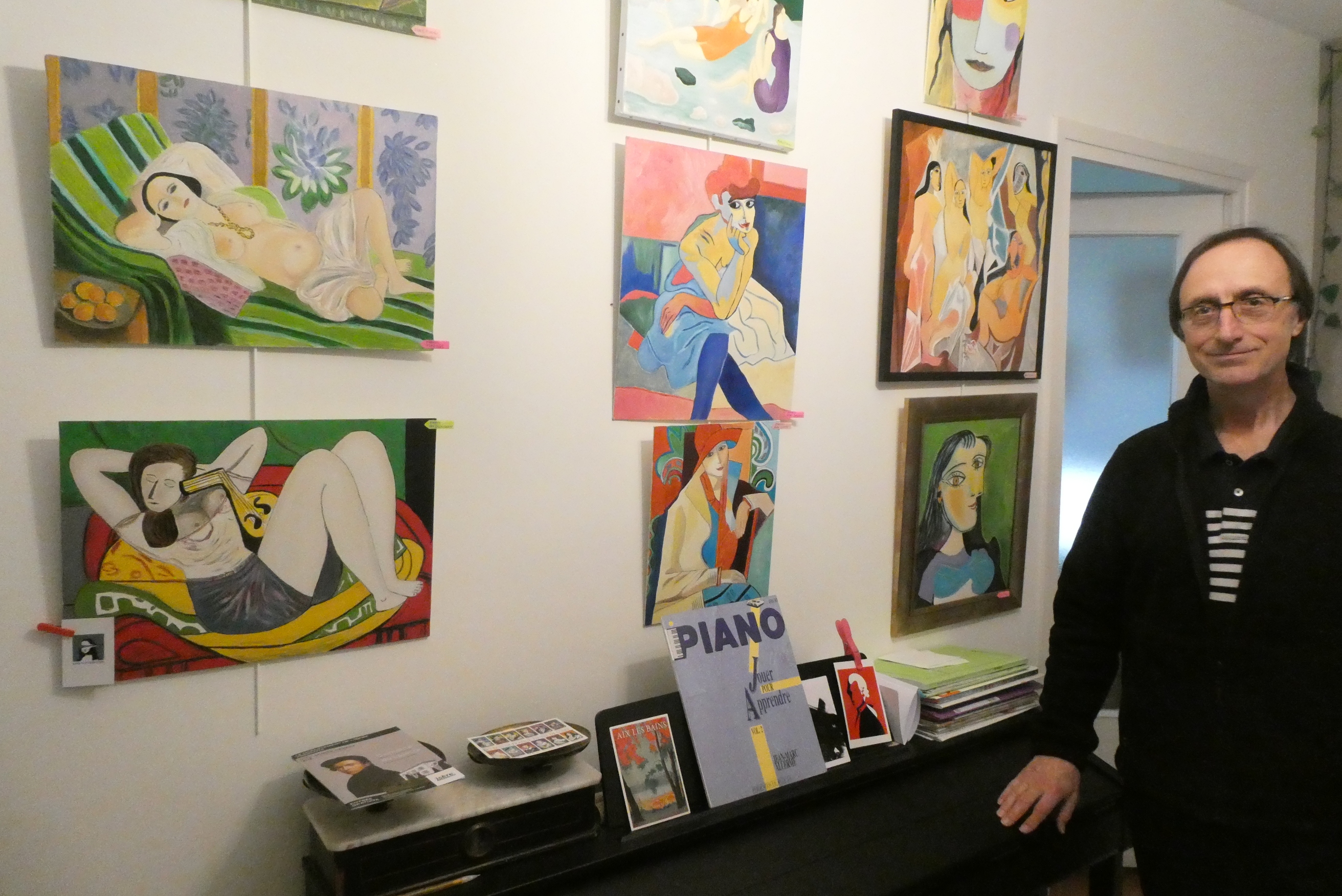 Michel nous reçoit chez lui, dans son atelier baigné de lumière. Sur la table, des livres, des tubes de peinture à l'huile, tout autour, sur les murs, sur les meubles, nous sommes immérgés dans son monde de couleurs, des dizaines de tableaux des Picasso, des Matisse, des van Dongen, des Lhote, des Gauguin, de nombreux expressionnistes allemands... Un rêve coloré éveillé...