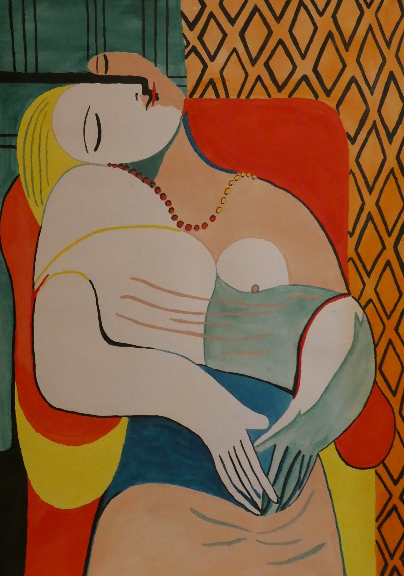 Depuis longtemps l'œuvre de Picasso m'attirait, me fascinait. J'éprouve un grand interêt pour le côté vif de sa peinture, je suis toujours à la recherche de la couleur, de sa profondeur, j'ai commencé à reproduire "le Rêve" de Picasso. Je l'ai exécuté en plusieurs dimensions sur du papier aquarelle. Puis on m'a offert un coffret de peinture à l'huile, j'ai pris mes pinceaux et j'ai reproduit le portrait de Dora Maar.
