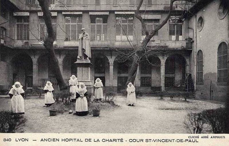 Avant le XVIème siècle le sort de nombreux enfants abandonnés était dramatique, réduits à errer et mendier dans les rues de la cité. Avec la création du Bureau de l'Aumône Générale en 1534, suite à la disette qui avait sévit à Lyon, furent accueillis les enfants orphelins légitimes dans des locaux loués par l'Aumône, les garçons au lieu-dit La Chanal et les filles dans la maison dite de Sainte-Catherine avant leur transfert à l'Hôpital de la Charité après sa construction en 1633. Nourris de bouillon et de pain, légumes et fruits étant inexistants, considérés à l'époque comme des aliments « qui ne tenaient pas au ventre », l'état de santé des enfants s'aggrava.