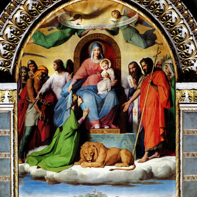 Une nouvelle épidémie, le choléra-morbus, vient frapper aux portes de la cité en cette année 1832, donnant lieu à un nouvel élan de foi. On fait à nouveau appel à Notre-Dame de Fourvière. Lyon est épargnée. C'est le peintre d'histoire religieuse Victor Orsel né en 1795 à Oullins qui réalise un tableau à la très riche et très symbolique iconographie pour rappeler ce moment de communion. Une Vierge à l'Enfant protège de son manteau la Ville de Lyon représentée par une femme à genoux coiffée d'une couronne à créneaux symbolisant les fortifications. A ses pieds le lion blessé. A gauche de la scène, on devine « la faucheuse » et un personnage avec la coupe empoisonnée, contenant le mal ; enfin l'ange qui, du plat de son glaive renverse la coupe. A droite du tableau, derrière Jean-Baptiste, l'artiste renvoie la scène aux premiers temps chrétiens de l'histoire de Lyon, avec Pothin, Irénée, Blandine, saints protecteurs. Orsel meurt à Paris en 1850. Ses élèves terminent cette œuvre allégorique monumentale (hauteur 6.75 – largeur 5,00m) en 1852. Elle est placée au-dessus de la porte de bronze de la basilique de Fourvière après 1896.