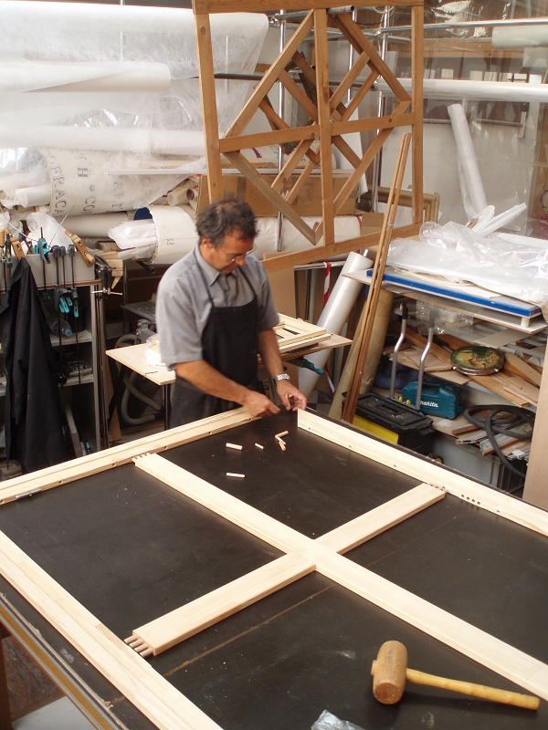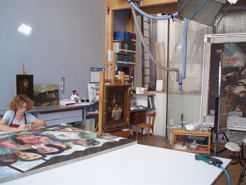 Au sein de l'atelier règne une organisation parfaite où chacun est spécialisé dans un domaine très précis. Une équipe s'occupe du support, une autre ensuite de la couche picturale.